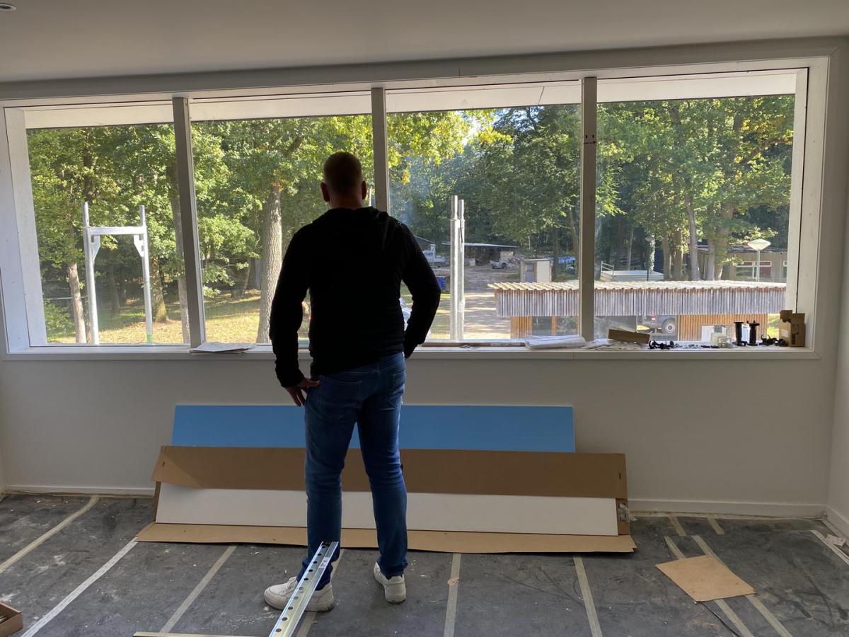 De zon staat deze ochtend hoog aan de strakblauwe hemel. Bas ontvangt zijn bezoek met stevige handdruk en een gulle lach. Zijn functie mag dan zijn gewijzigd, hij blijft one of the guys. Een man met een open uitstraling en een gezonde portie humor. ,,Ik weet hoe goed ik het hier heb en hoe fijn het is om op deze locatie te werken.” Doordat de verbouwing langer duurt dan vooraf gepland is het nog even improviseren, maar bij Oranjeborg wordt altijd in kansen gedacht. Niet kijken naar wat er niet is, maar optimaal gebruikmaken van wat wél kan. ,,Wil je koffie?” Hij loopt de trap op naar de kleine geïmproviseerde ruimte, die hij deelt met orthopedagoog Linge Smouter en locatiemanager Wout van den Broek. Het uitzicht is prachtig en zal menig eigenaar van een vakantieresort jaloers maken. ,,Kijk”, zegt hij, terwijl hij wijst naar de oude kantoorruimte. ,,Hier hebben we nu drie kamers voor de jongens ingericht.”