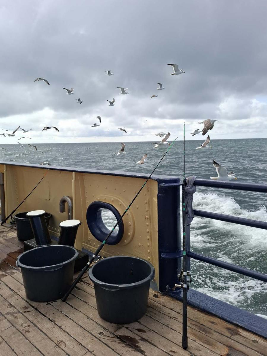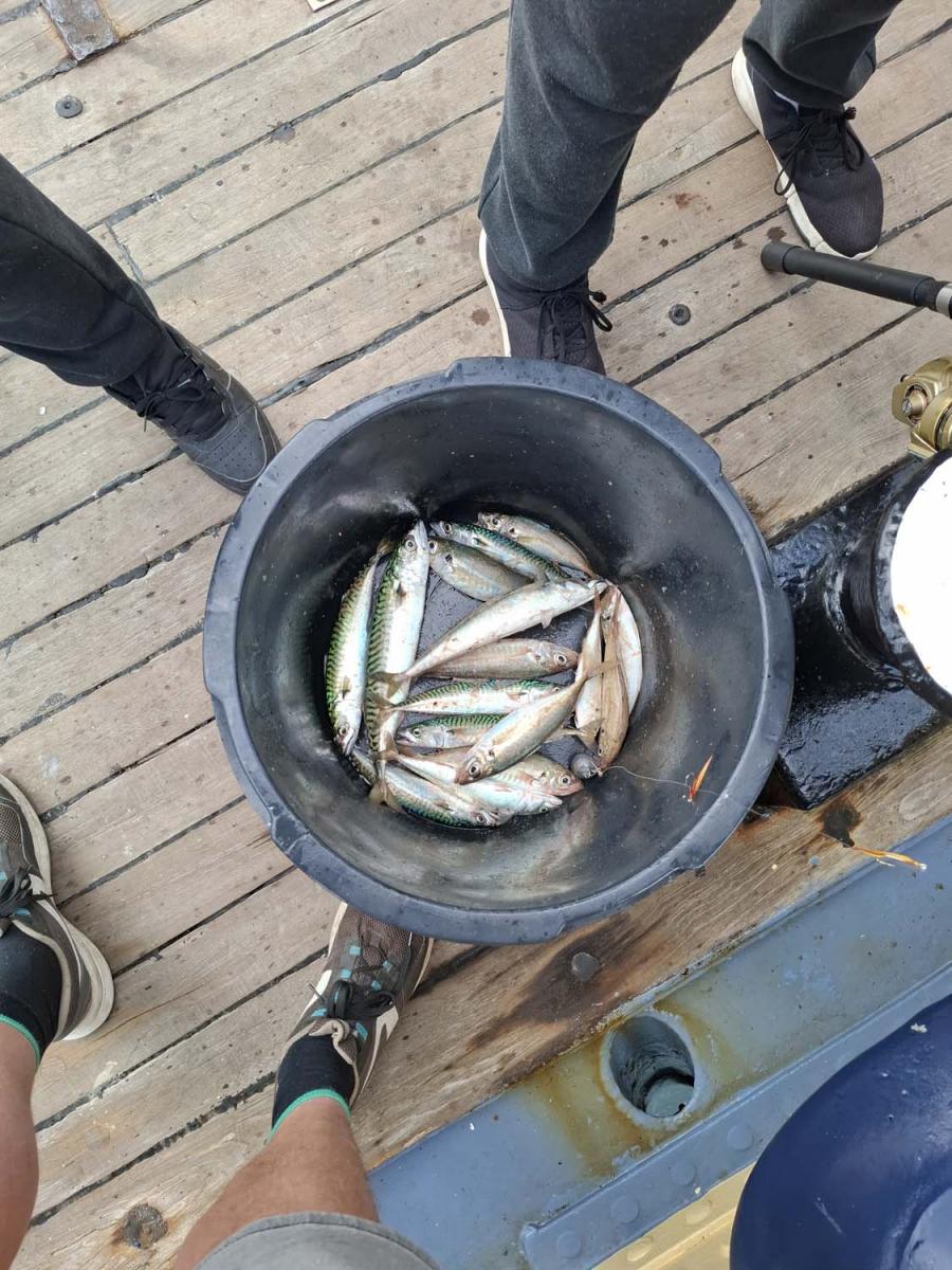 We hebben gedurende dag 124 makrelen gevangen. Deze hebben we meteen op de boot schoongemaakt. Kevin vond dit een vies klusje: mooi voor een ander. René draaide z’n hand er niet voor om en hielp goed mee. En de meeuwen hadden ook wat te eten, want de ingewanden kon je naar hen toe gooien of in het water en waren snel op. Als bedankje poepte er nog een meeuw op mijn schouder.