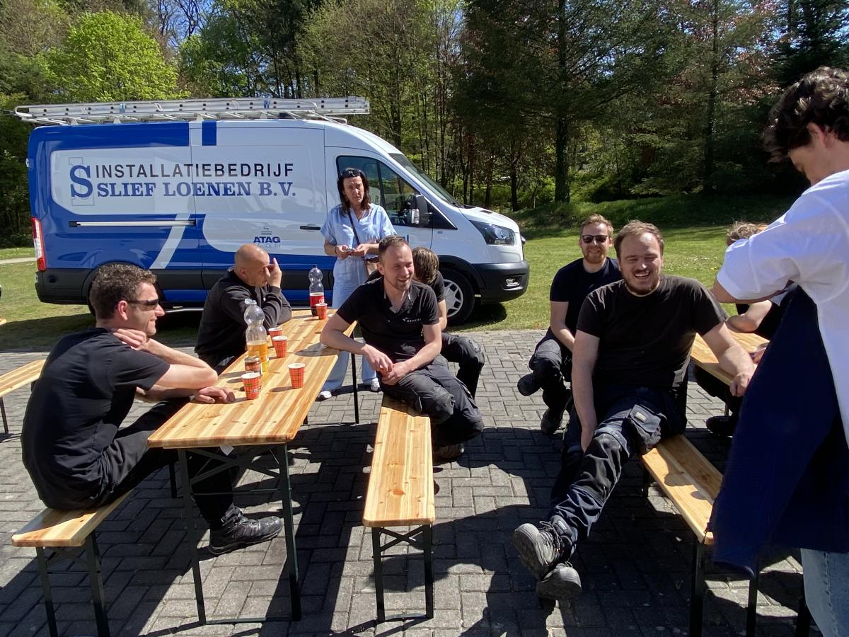Sinds januari 2025 zijn veel medewerkers van Slief bij Oranjeborg over de vloer geweest voor onderhoudswerkzaamheden en de verbouwing van maar liefst twaalf badkamers. Na hard werken is het goed om te ontspannen. Dat gebeurt tijdens een barbecue op vrijdagmiddag 24 april, waarbij het voltallige personeel van Slief aanwezig is.
